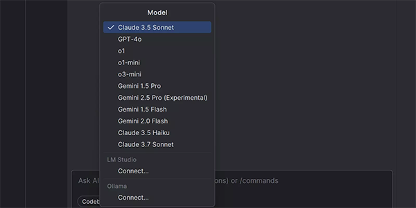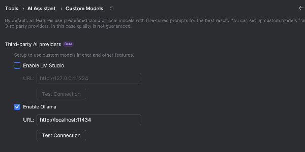 AI Assistant 让您可以灵活地在离线模式下使用本地模型,也可以利用基于云的 AI 处理。 现在,它支持离线模式,让您可以在没有互联网连接的情况下工作,同时仍然受益于 AI 赋能的编码辅助。 通过 Ollama 或 LM Studio 将本地模型用于聊天、代码生成、提交消息、内联文档等。