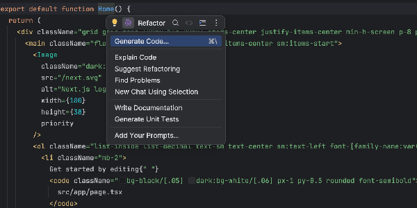WebStorm 2025.1 引入了新的浮动工具栏,此工具栏会在按 Alt+Enter 或选择代码时显示。 借助此工具栏,您可以快速访问 AI 功能、重构、代码重新格式设置和 Surround With(包围方式)操作。