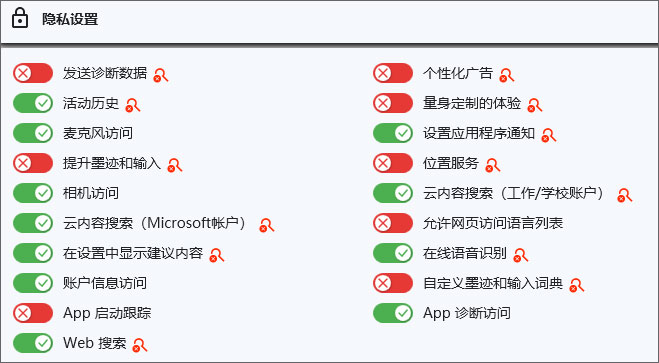 4、winhance优化方面,主要有:Windows安全设置、隐私设置、游戏与性能、电源设置、资源管理器、通知与声音等,比如隐私设置调整项较少,不过都是直中要害的关键隐私设置,大家按需关闭。