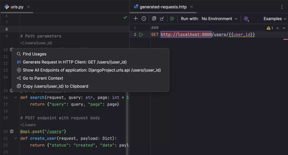 Endpoints(端点)工具窗口现在支持 FastAPI 中挂载的应用,包括 Django 和 Flask 应用。 挂载的路由会被检出并在 Endpoints(端点)工具窗口中显示,带有正确的路径前缀,使多应用项目更易管理。