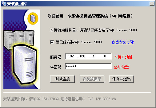 本系统采用SqlServer2000作为系统数据库,因此您必须保证服务器电脑上安装有Microsoft SQL Server 2000系统。