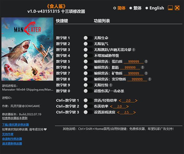 风灵月影版修改器提供了多种实用功能,比如无限生命、氧气、跳跃、不增加威胁等级等,这些都能让游戏变得更有趣。特别是“无限跳跃/声呐无需冷却”和“超级伤害/一击必杀”这两个功能,简直是战斗党的最爱!操作也挺简单的,通过数字键和Ctrl组合就能快速调用。