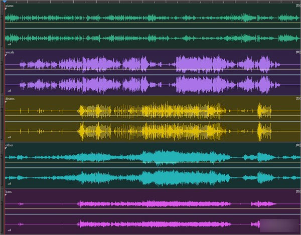 把这五个轨道拖入audition试试吧,效果非常好,完全按照乐器剥离了。