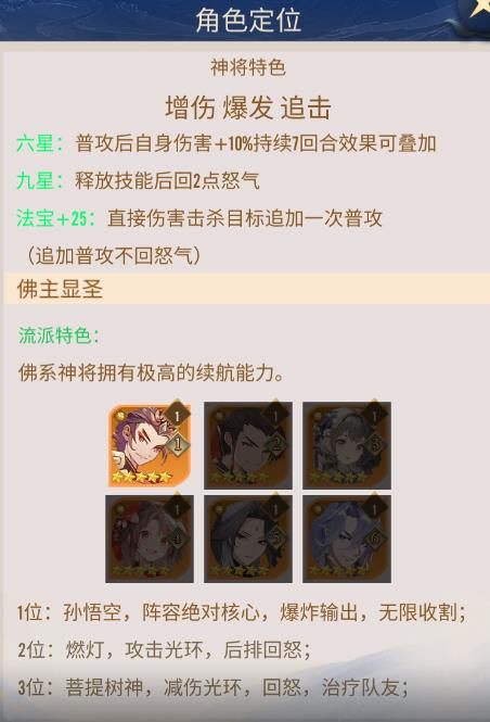 3.十星被动:释放技能后追加一次普攻,和飞三被动:己方佛禅阵营神将释放技能时,追加释放一次普攻。每回合可以增加三次普攻,绝对是输出英雄的克星。如若搭配法相的最终伤害增加和附带间接伤害肉盾也很难在悟空的棍棒下幸存。
