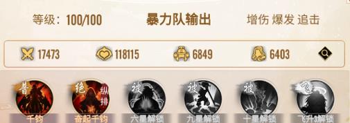 千钧/奋起千钧:T2,基础输出技能,为星级与法宝效果提供触发载体,是输出循环的基础。且奋起千钧每次释放技能也可以额外增加自身10%的伤害,战斗的时间越长伤害越是恐怖。