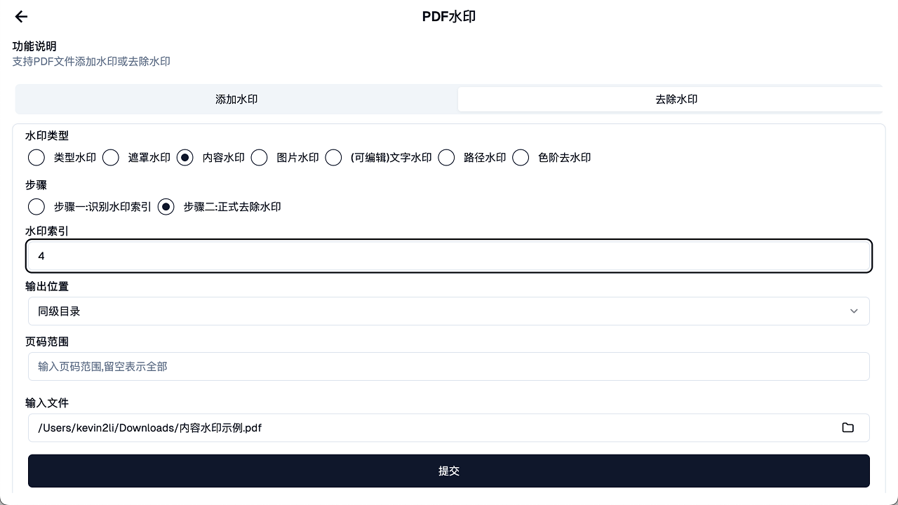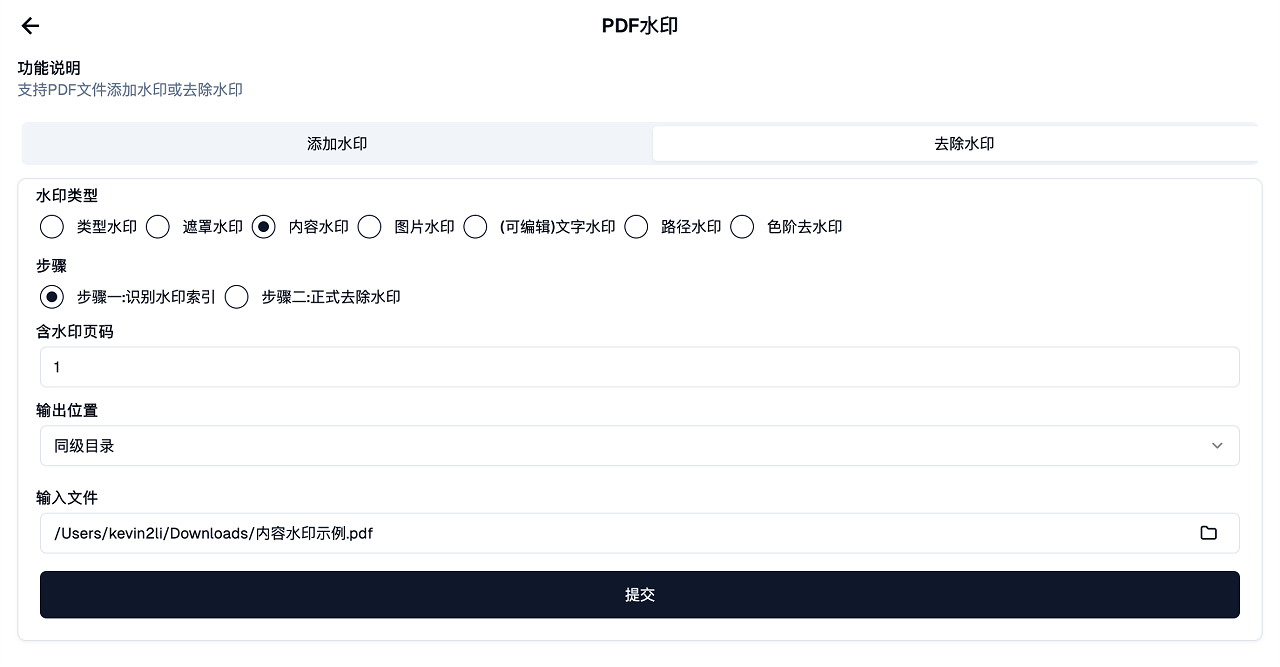 为了尽可能适用更多类型的PDF文件,本软件将去水印方法一共分为两个步骤: