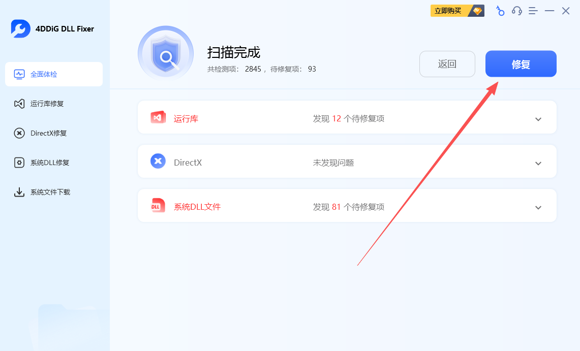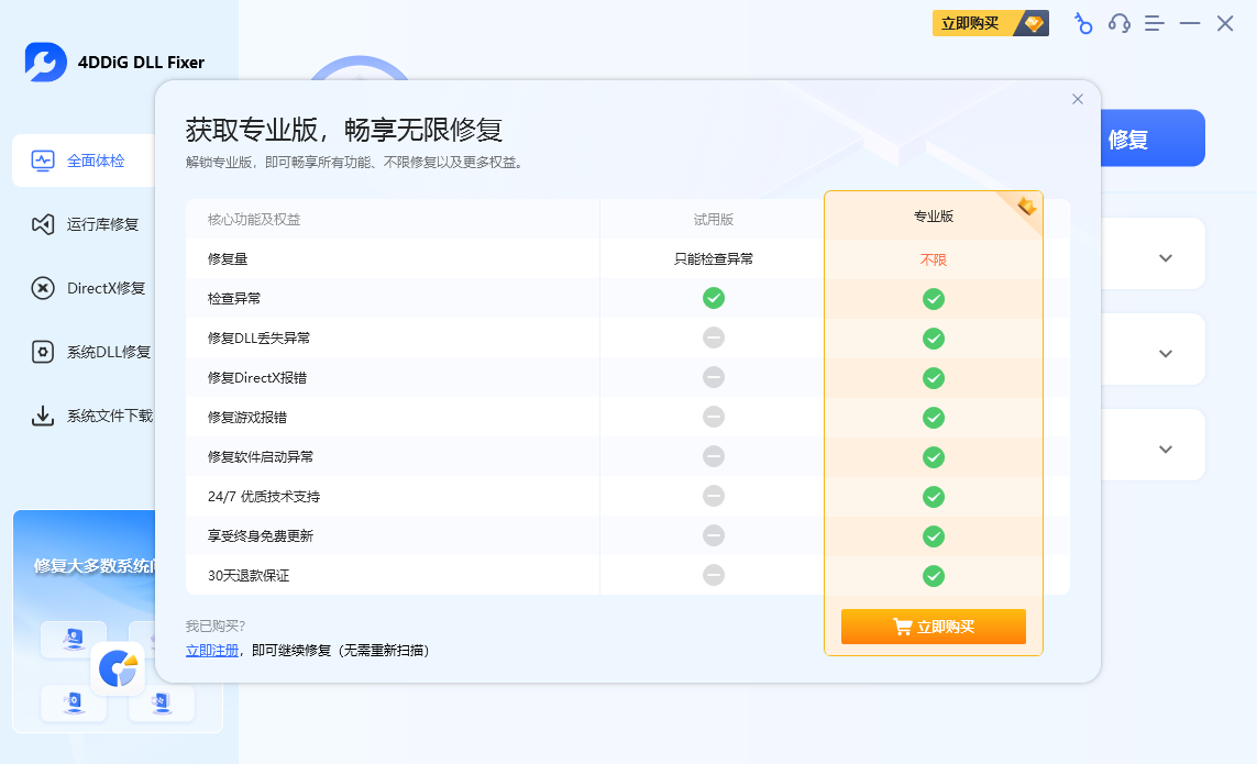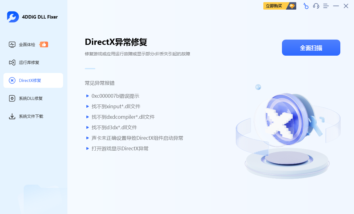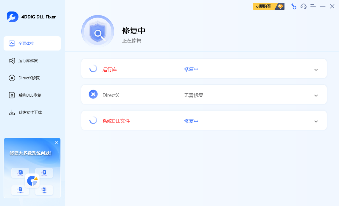 修复运行库、DirectX、系统dll文件异常引起的应用程序无法正常使用等问题。