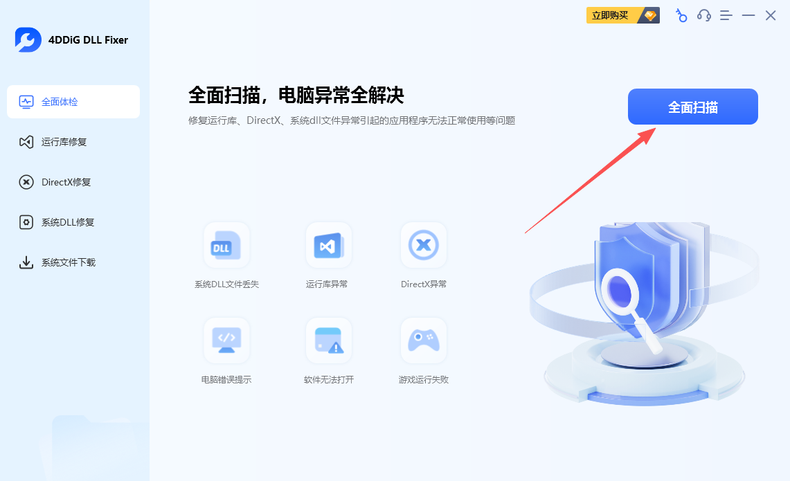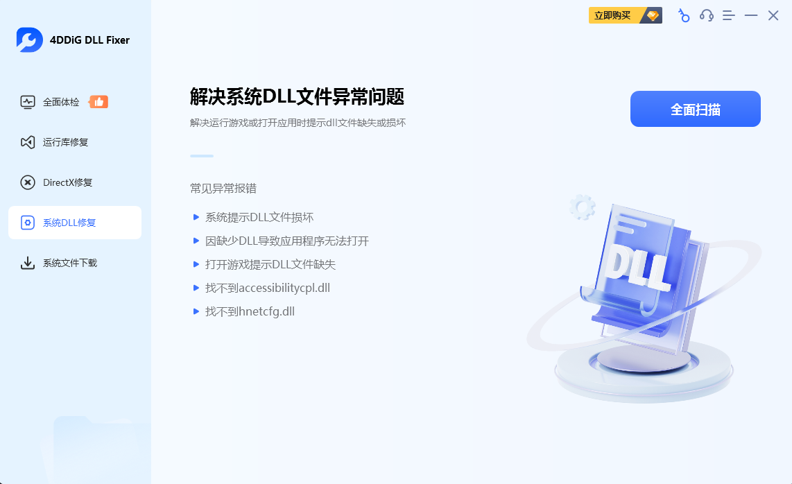 9、运行4DDiG DLL Fixer,在主界面中点击全面扫描。