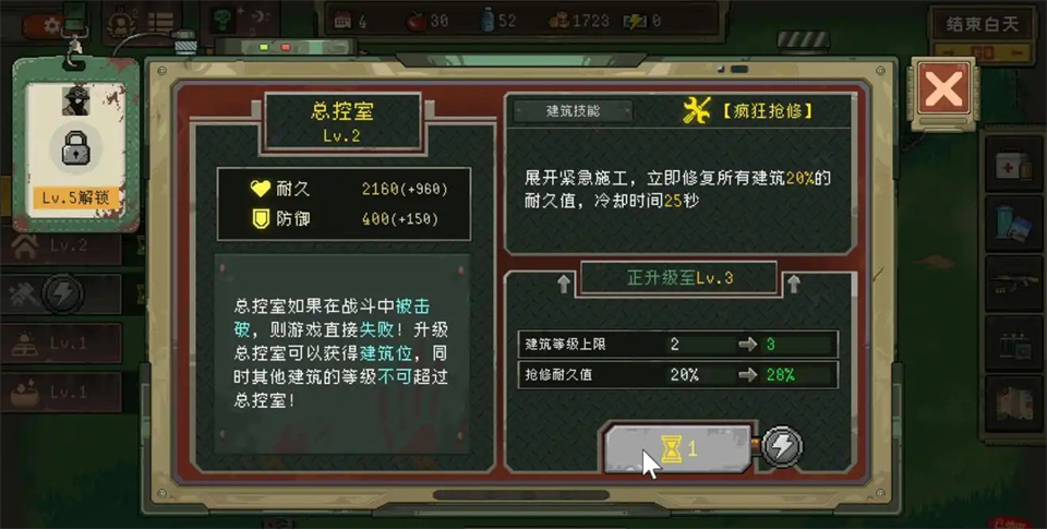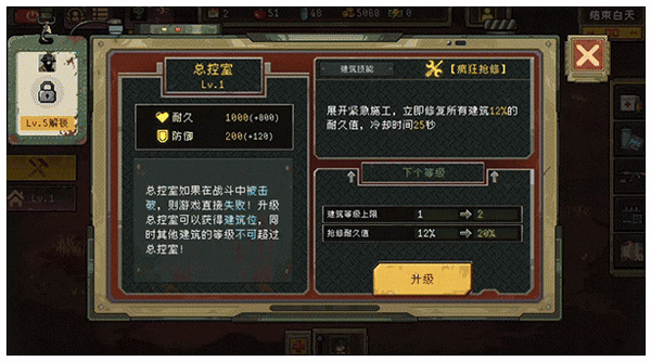 所以想要求生,在游戏开始前会有提示建在指定的建筑,且要升级到特定的等级和制造出相应的物品来,这一句才算赢,不然随着僵尸的压力越来越大,基地被拆掉也是早晚的事情。