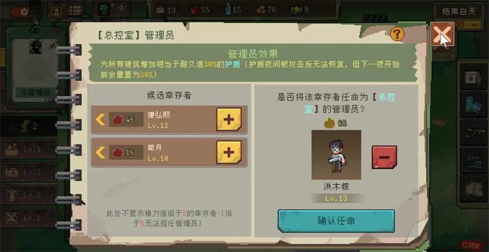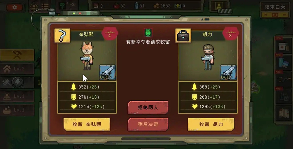 只要撑过几个回合就会有野生的队友申请加入玩家这边当玩家的队友,在这种末世环境下,人力资源也很重要的,人手多可以分配干活,外派探索等。
