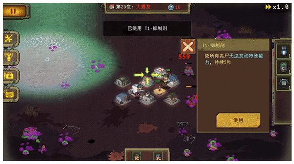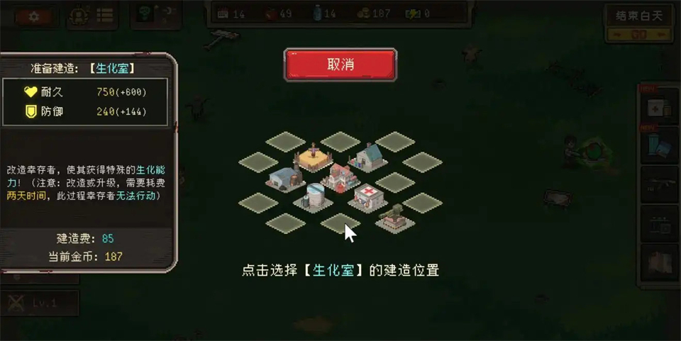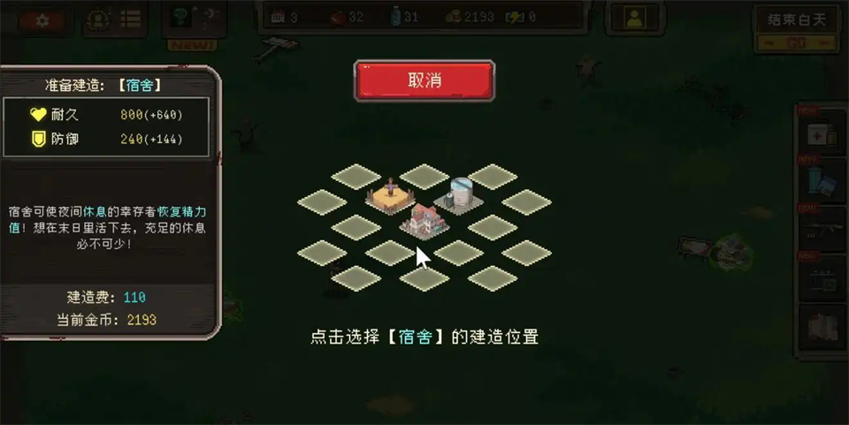 游戏中,白天安全,但需要合理分配精力和时间来建设基地。建造宿舍、农田、蓄水池等设施可以提高生存率,医疗站能治疗队员的感染情况。队友会主动加入,但他们的精力和感染值会影响战斗力。晚上防守时,合理布阵和使用道具是关键。