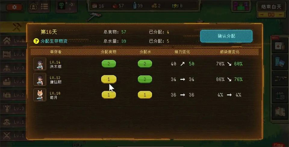 所有队员有两个非常重要的数值,一个是精力,白天的任何行动都需要精力,另外一个是感染值。每防守完一次晚上的攻击,队员都会有不同程度的感染上升,感染达到100%就会死亡。每次战斗结束后分配的食物和水,2份食物才能多恢复体力,1份水会维持感染值,2份水才能减少感染值。