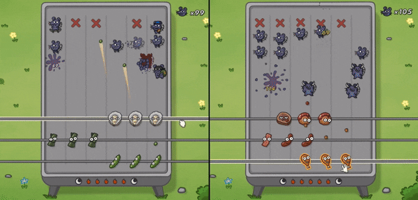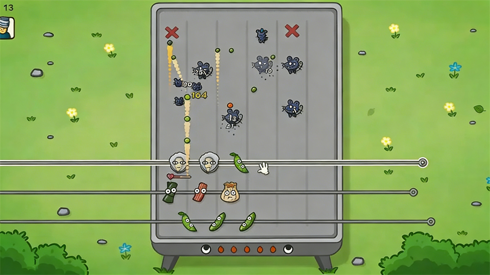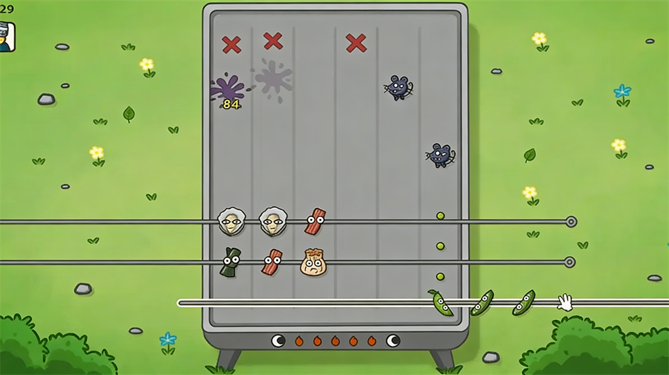 最上面一条烤串最好放防御类的食材,比如洋葱和生蚝,因为在第10波之后会出现远程进攻的鼠鼠,如果没有防御的话,子弹会直接攻击我们的烤炉,掉耐久度。烤炉的耐久就和其他塔防游戏里的大本营一样,一旦耐久度掉光,我们会直接失败。因此必须要用食材抵挡,输出类的食材血条比较脆弱,而且还会被击晕,只能用防御类食材进行防御。防御类食材在抵挡伤害的时候会给敌人弹飞造成一定的伤害,一定要注意弹的角度,如果把敌人弹到后面两串的空间上来的话,我方防御阵容就会瞬间土崩瓦解。