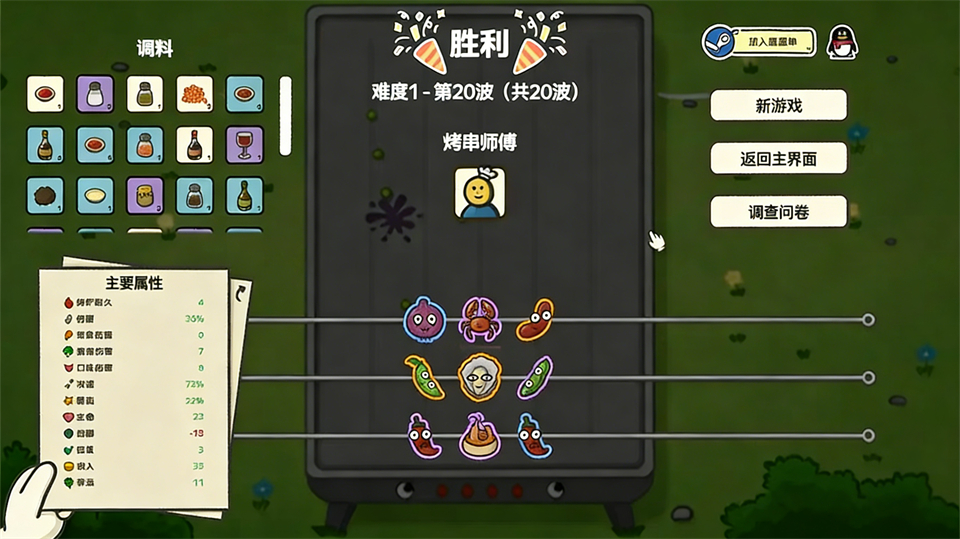 我个人觉得这个游戏的创意挺有意思的,把塔防游戏和烧烤结合起来,既有趣又有创意。游戏中还有随机出现的强化调料和道具,每次游玩都能体验到新鲜感。虽然目前只有三个难度,但已经能感受到策略上的深度了。特别是辅助类食材,比如生蚝,既能当肉盾又能给子弹加buff,真的很实用。