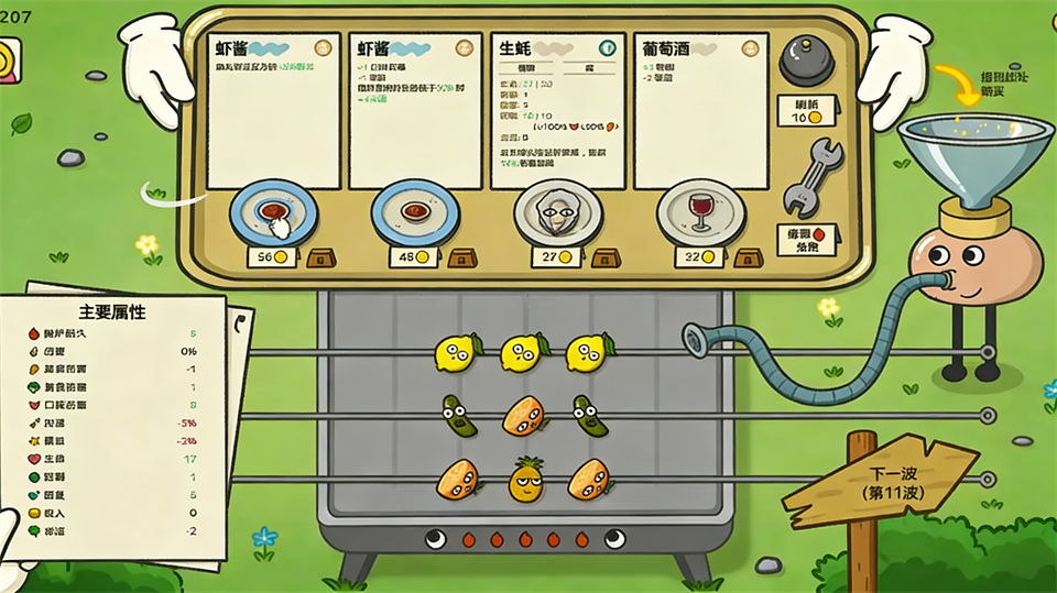游戏里的属性包括防御、暴击率、幸运值、攻速等多种类别,这些东西如何提升呢?那就要说到食物里的辅料了,比如醋、芥末酱这些调味品,或者红酒、西瓜汁这样的饮品,亦或是棉花糖、鱼子酱、鲑鱼籽这类辅食。他们在提升一项或两项属性的时候,往往会降低其他的属性,这个就要结合我们玩的流派来看了,有些食材甚至是禁暴击的,那么暴击率的用处就不大了,总体来说提升的幅度肯定要比降低的大。不过目前demo版本只有前三个难度,不太清楚后续难度会如何!
