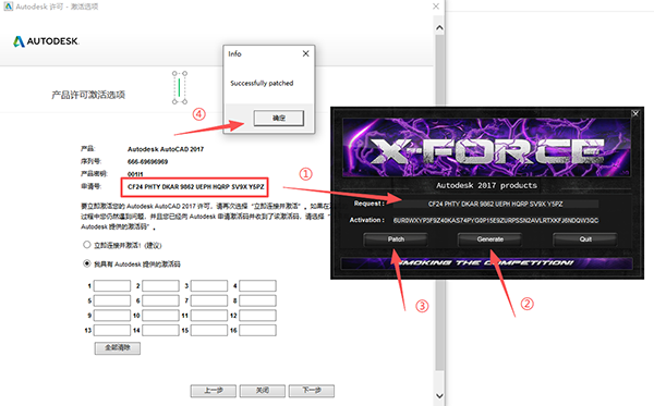 15、将申请号复制到注册机中,点击【Generate】,生成激活码,点击【Patch】,出现【Successfull patched】提示,点击【确定】。
