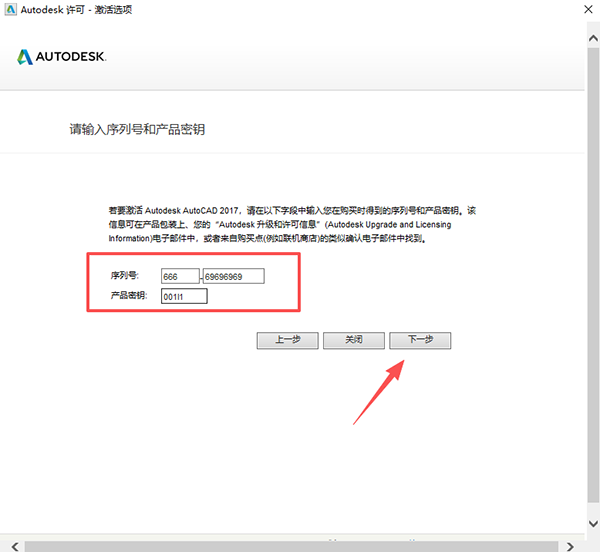 11、输入序列号【666-69696969】, 产品密钥【001I1 】,点击【下一步】。