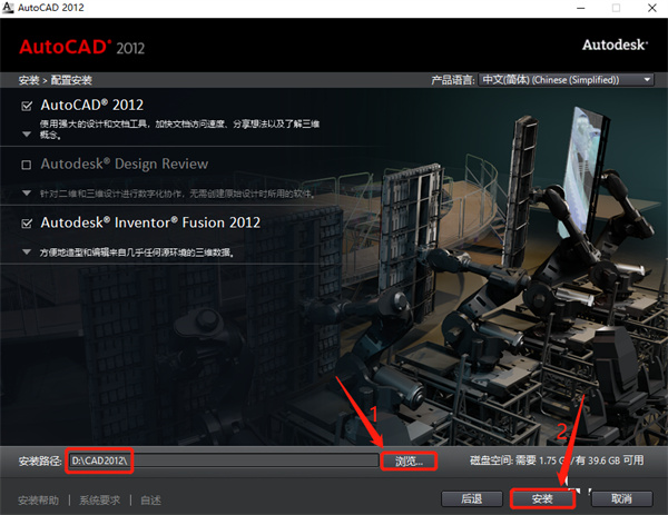 6、点击【浏览】可更改安装位置(建议不要安装在C盘,可以在D盘或其它磁盘下新建一个“CAD2012”文件夹。注:安装路径中不能有中文),点击【安装】。