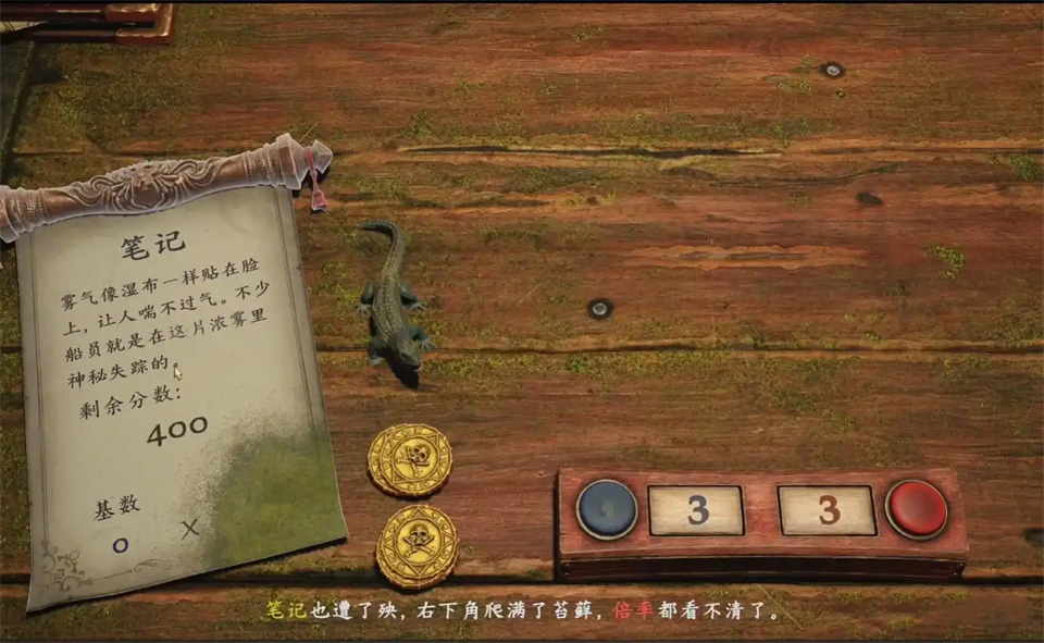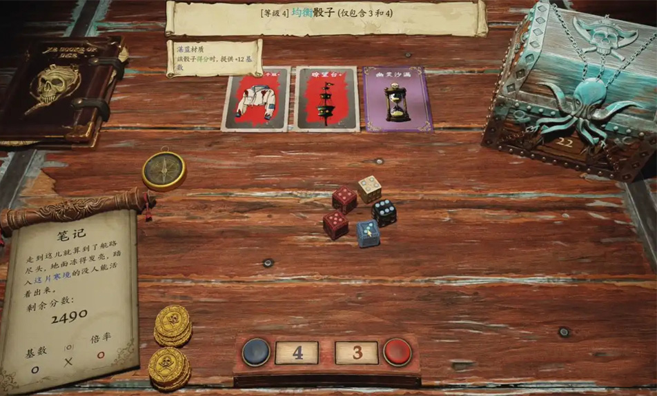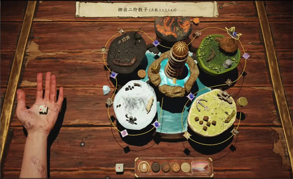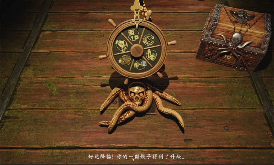 刚开始玩家手上的是一阶旅行骰子,在加速节点花费金币修复船只可以获得更高一级的骰子,比如上图所示节点,如果不能掷出四就会被卷入漩涡,强制多打一个地图,但是一阶旅行骰子只有1、2、3三种点数,也就是到了这里没升级旅行骰子的话,就只能去多打一个地图了。