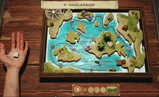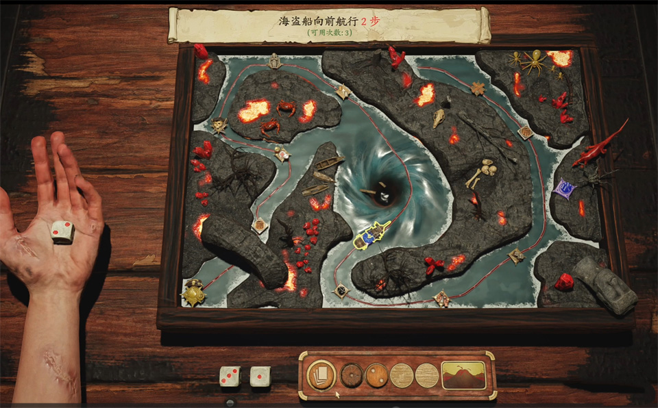 然后说一下游戏的地图,每个大关都是一张新的地图,大部分情况下玩家可以看到地图上其他地点的情况,玩家在地图中的移动主要依靠掷骰来决定的,但也可以使用下方的航行按钮移动固定点数。