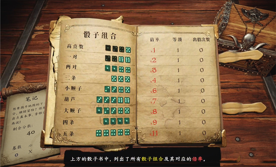 游戏以掷骰为基础玩法,5颗骰子有9种骰子组合,每种都有其相应的倍率,将有效的骰子组合中每一个骰子的点数相加就是基数,基数乘以骰子组合的倍率就是当前的得分。