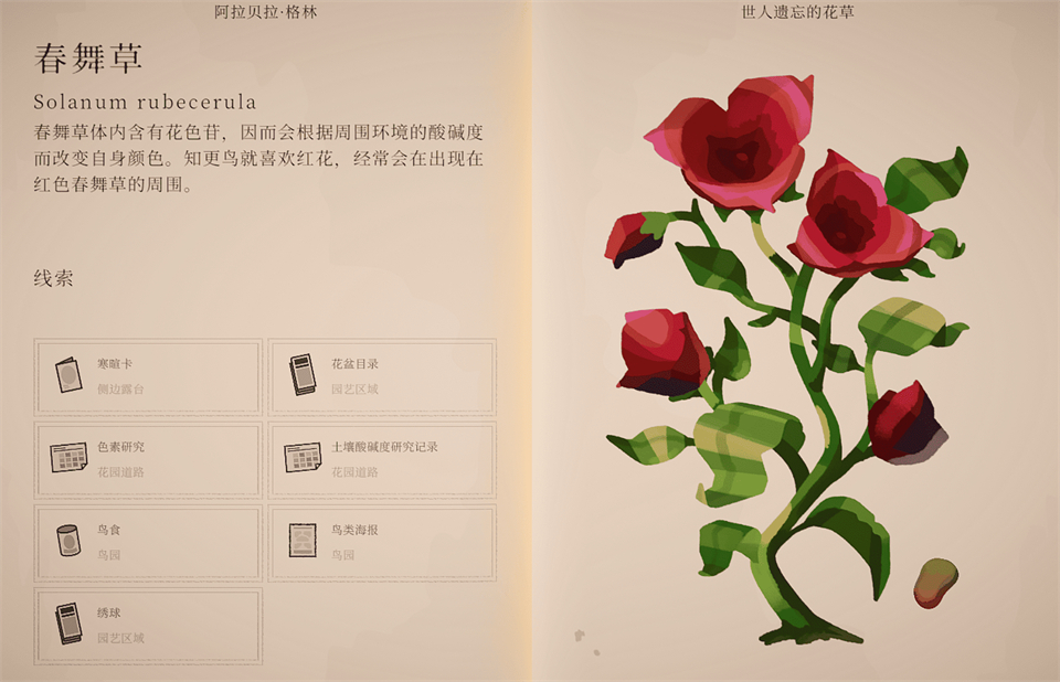 成就:【春舞草】在鸟类海报确认花园道路栖息的知更鸟授粉红花,确认适宜红花生长的pH12-14内的唯一组合砂岩盆+海藻pH13.2。把砂岩盆种植并浇水、海藻滋润过的幼苗放在鸟园内,用两个鸟食盆交替引诱花园道路鸟巢里的知更鸟跟随到鸟园授粉。