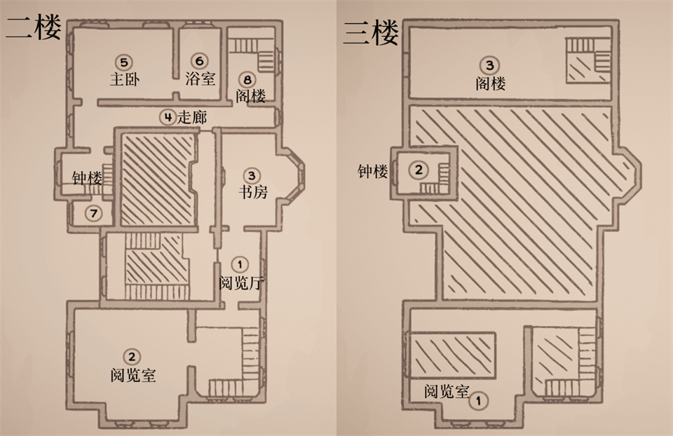 绿头鸭从二楼⑧阁楼上楼到三楼③阁楼深处