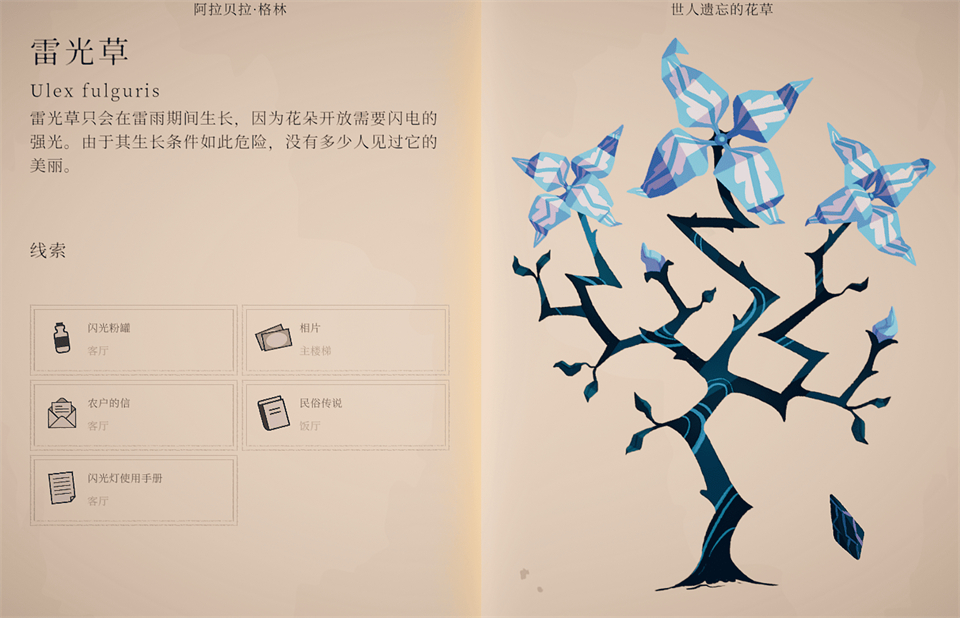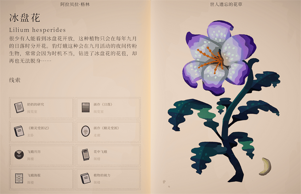 成就:【冰盘花】在飞蛾月历确认画作《精灵受困》上的豹灯蛾,在奶奶的地窖找到豹灯蛾的生长范围9月的日落颜色蓝、黄、橙、红。在阁楼投影对应颜色的幻灯片引诱感光幼苗开花。