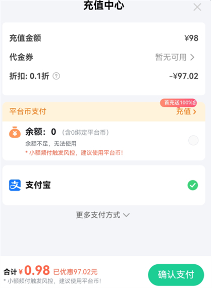 3、选择其中一个档位就能开始充值了,例如98档位的,本站提供的是0.1折版所以实际只需要支付0.98元就可以了。