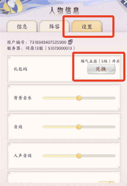 2、点击设置即可输入兑换码兑换,炼气五层(5级)开启兑换码功能。
