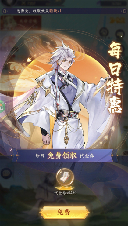3、点击【免费】就能领取到6480不限时代金券了,每天上线都能领取,1代钞=1元,买礼包和充值的时候都能使用。