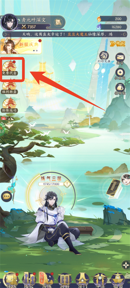 2、点击下方【修仙】,在左上就能看到【免费代金】这个活动。