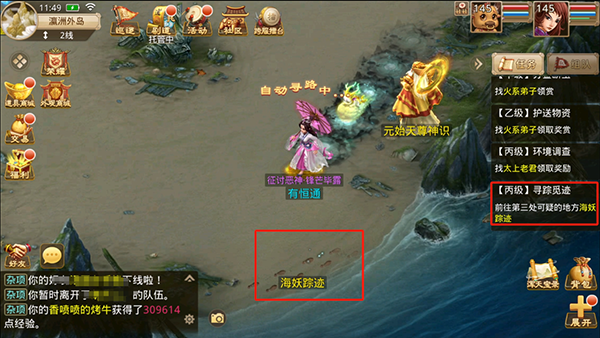 说明:瀛洲外岛有一伙海妖肆虐,快去将其驱逐吧!该任务很简单,按照指引进行对话进入战斗,战斗胜利即可完成。