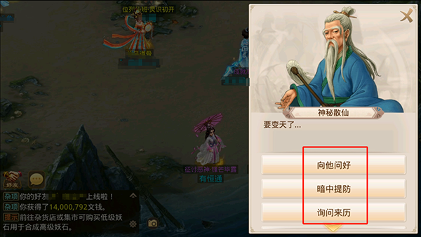 说明:瀛洲某处似乎来了一位云游的散修,快去拜访一下吧。右侧任务栏点击该任务,会自动寻路至神秘散仙处,和其对话即可完成任务。