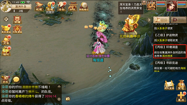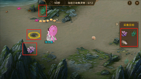 说明:帮助太上老君收集一些瀛洲地域上的样本。右侧任务栏点击该任务,会自动寻路分别采集海水、土壤和植物样本,采集完成即可完成任务。