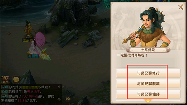 说明:有一名在瀛洲修行的弟子似乎有些烦恼,快去看看吧!右侧任务栏点击该任务,会自动寻路至师兄处,和其对话即可完成任务。