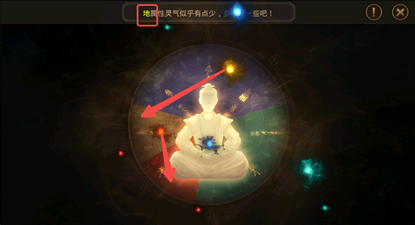 说明:瀛洲外岛一处地方灵气异常浓郁,快去探查一番吧!该任务需要将图中4种颜色均分圆盘,点击不同颜色的灵气可以增加对应颜色的比例,可以根据图中轮盘各种颜色区域大小和上方文字提示去点击对应的灵气,直至4种颜色平衡即可。如图示就是地(黄色)和火(红色)灵气缺少,我们就要点击红和黄色的灵气去增加黄色和红色的比例。