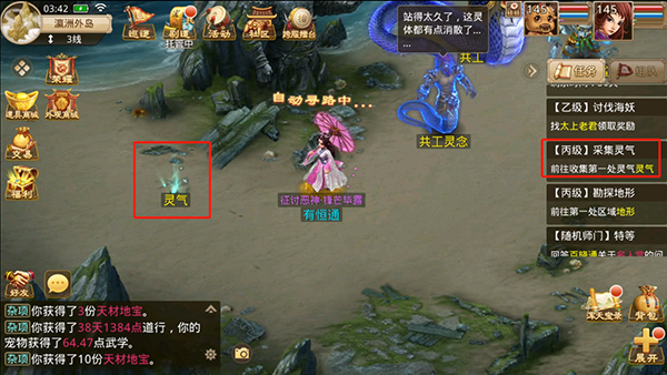 说明:前往瀛洲外岛帮助太上老君收集三处灵气。右侧任务栏点击该任务,会自动寻路寻找三处地图上的3处灵气,采集完成之后即可完成任务。