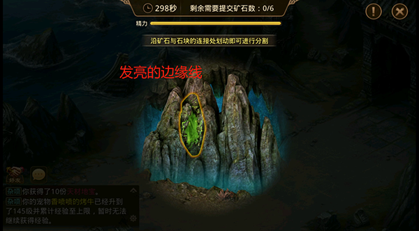 说明:五派弟子开采了些许原石,快助其将矿石分镏出来吧!该任务需要根据发亮的边缘线提示,确认石块的位置,然后沿石块边缘用手指进行滑动,将石块分割出来即可完成,大家用手把压着线的石块涂抹一下就行了。甲级乙级均有,甲级要求分割6块,乙级要求分割3块。