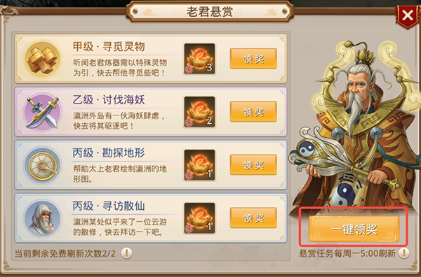 3、做完任务后可以直接一键领奖,可以获得7个天材地宝和比较可观的道武奖励。领奖完成后,本周的周常任务就没了,非常省心。
