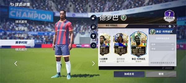 因此我们在获得了德罗巴之后,就要根据其定位来设计使用思路:作为一名典型的站桩前锋风格类型的前锋,我们在使用他时应尽量使用期对抗好终结能力强的特点,得球后若无法形成射门,尽可能将球传给其他球员做无球接应。而在阵容选择上,若使用双前锋阵容,建议一高一快搭配,双方做优势互补,德罗巴可以做前方的支点,也可做终结点;若使用带边锋阵容,视德罗巴跑位情况适时传中,也能起到不错的进攻效果。