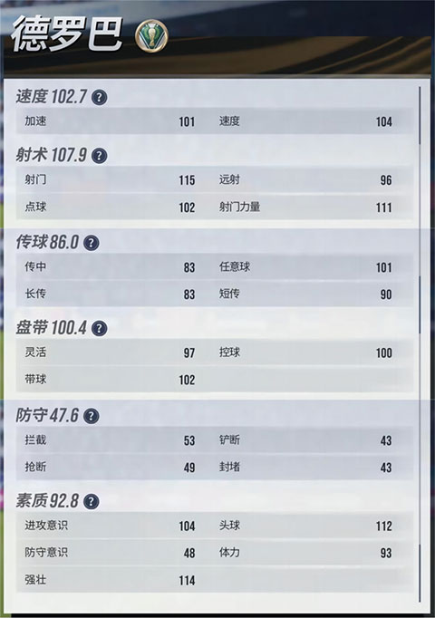 一是射门精准。德罗巴射门时球速极快,往往能够打出让守门员来不及反应的刁钻射门,在禁区内头球抢点的成功率很高,对比而言,德罗巴射门的精准度和稳定性是独一档的,甚至略强于其他满潜102级别的中锋球员。