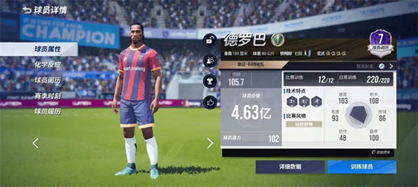 1、球员属性面板如下,第三个技术特点未升满(4级)、缺少1个皮肤、其他训练均满的情况下,身价4.63亿。