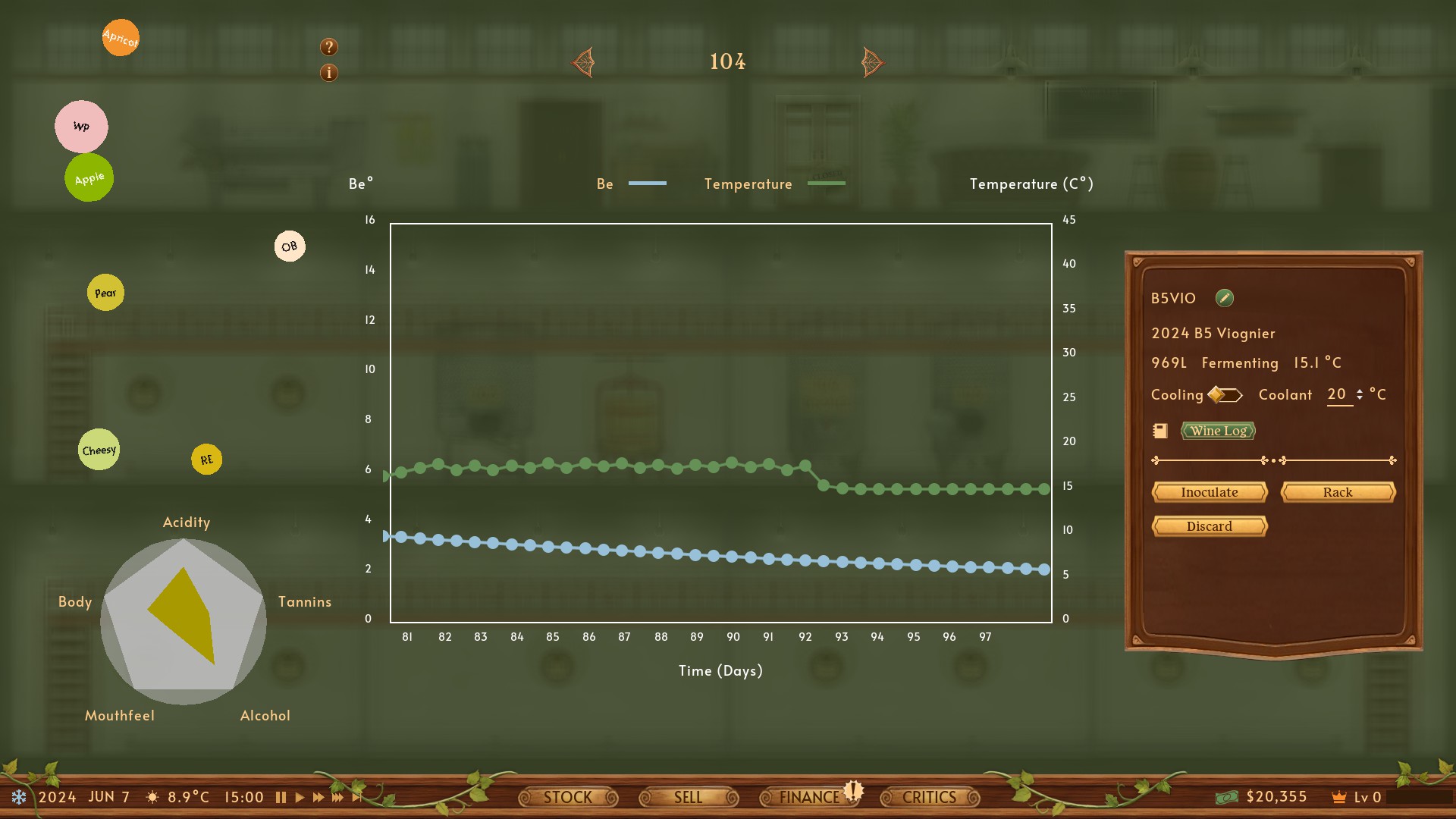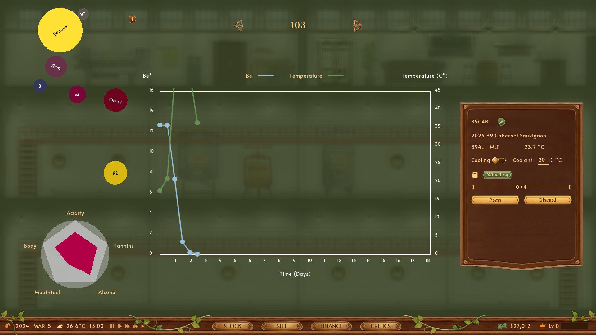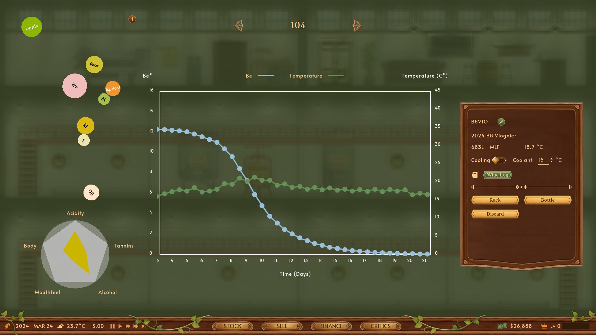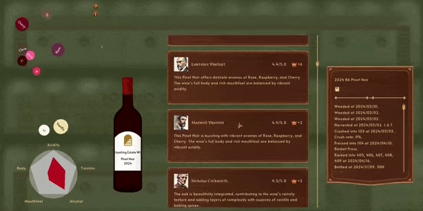 游戏特色包括从种植到装瓶的真实模拟体验、动态评分系统、混合酒调配艺术以及各种风土和气候挑战。发酵是关键环节,良好的发酵需要控制温度和时间,过快或过慢都会影响酒的质量。如果发酵太快,可能会产生异味;太慢则可能导致变质。玩家可以通过冷却系统、酒帽管理和调整酵母来维持良好发酵。