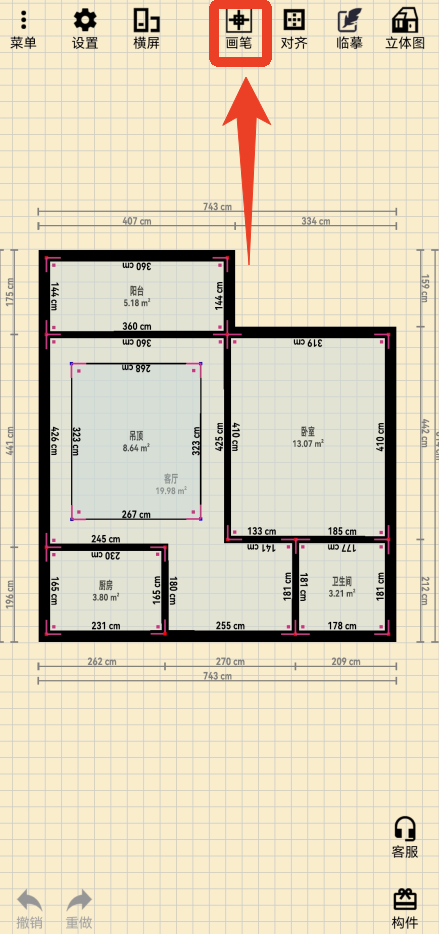 2、点击上方的【画笔】即可修改默认的户型图。