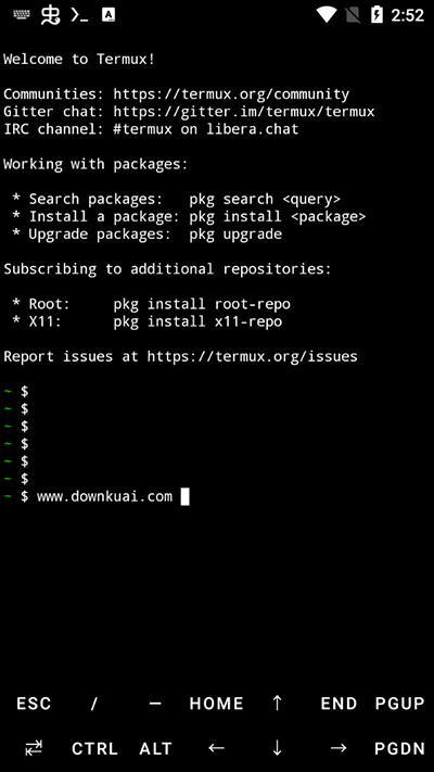 等待 Installing bootstrap packages (安装引导程序包)结束后可看到 Termux 的欢迎界面,如下图。