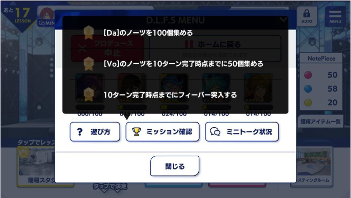 2、在10次训练(10ターン)的时候要收集完Da/Vo/Pf几个(上图2)