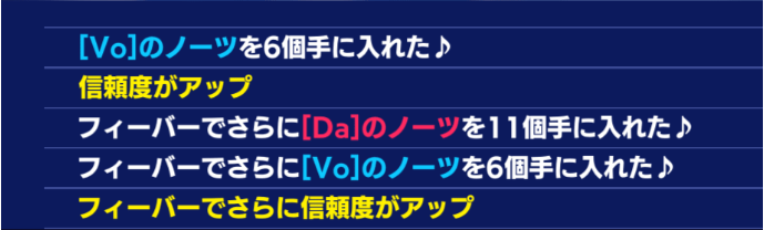 下次有小偶像来的时候[Da]跟[Vo]的量就从9/5变成18/10,Fever值增加量也会翻倍