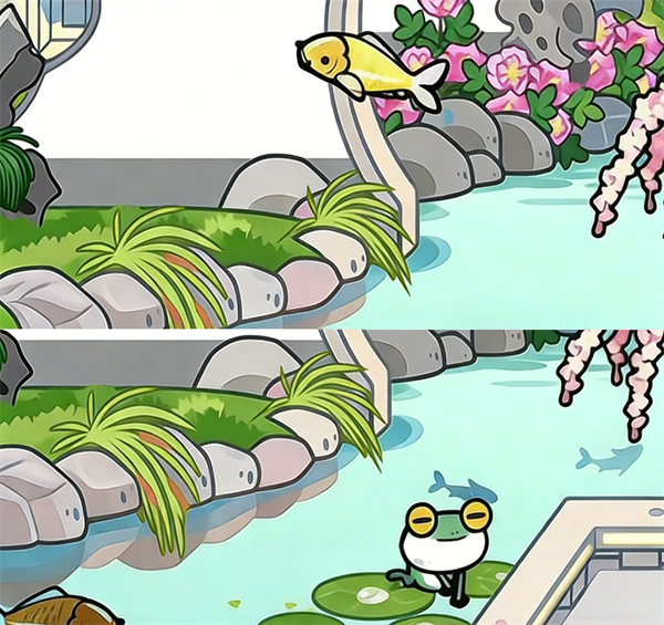 4、池塘中的鲤鱼会跃出水面,青蛙也会在荷叶间跳跃,场景非常生动。