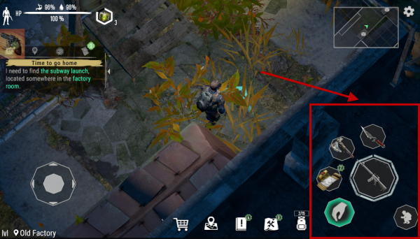 2、界面右侧分布着多种功能按钮,可进行拾取物品、下蹲躲避以及使用不同武器进行攻击等操作。